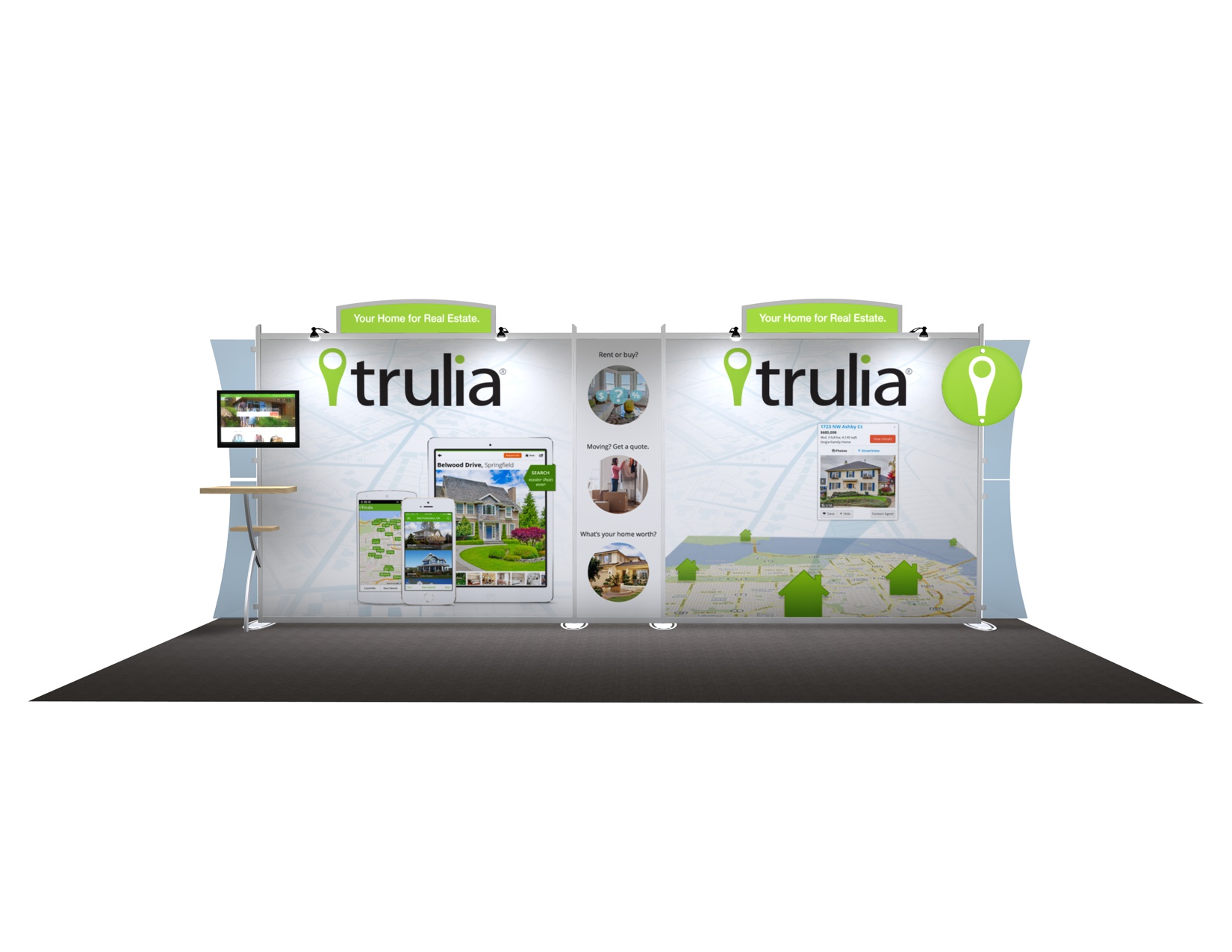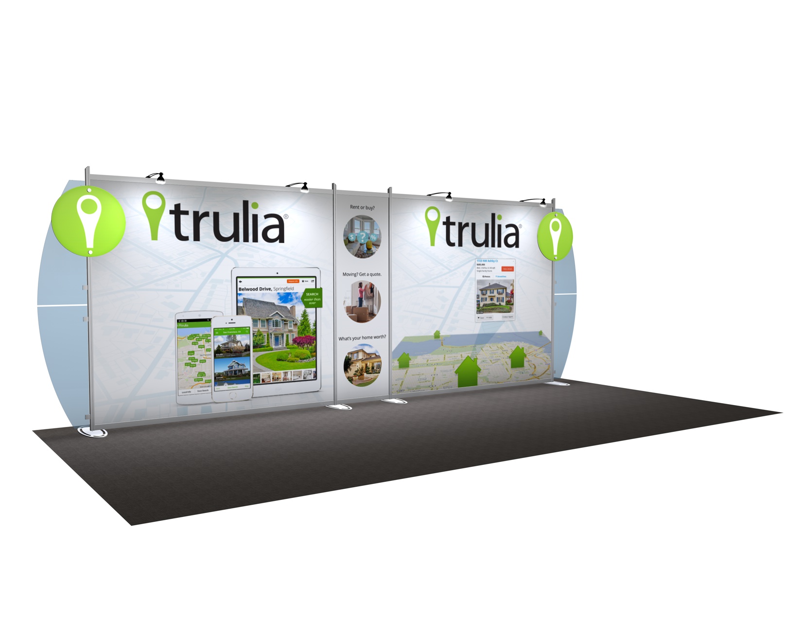 At trade shows, inline or linear trade show displays are generally arranged in a straight line alongside other exhibits. With this in mind, it’s especially important that they’re bold and eye-catching. Common inline display sizes include 10x20, 10x30 or larger.