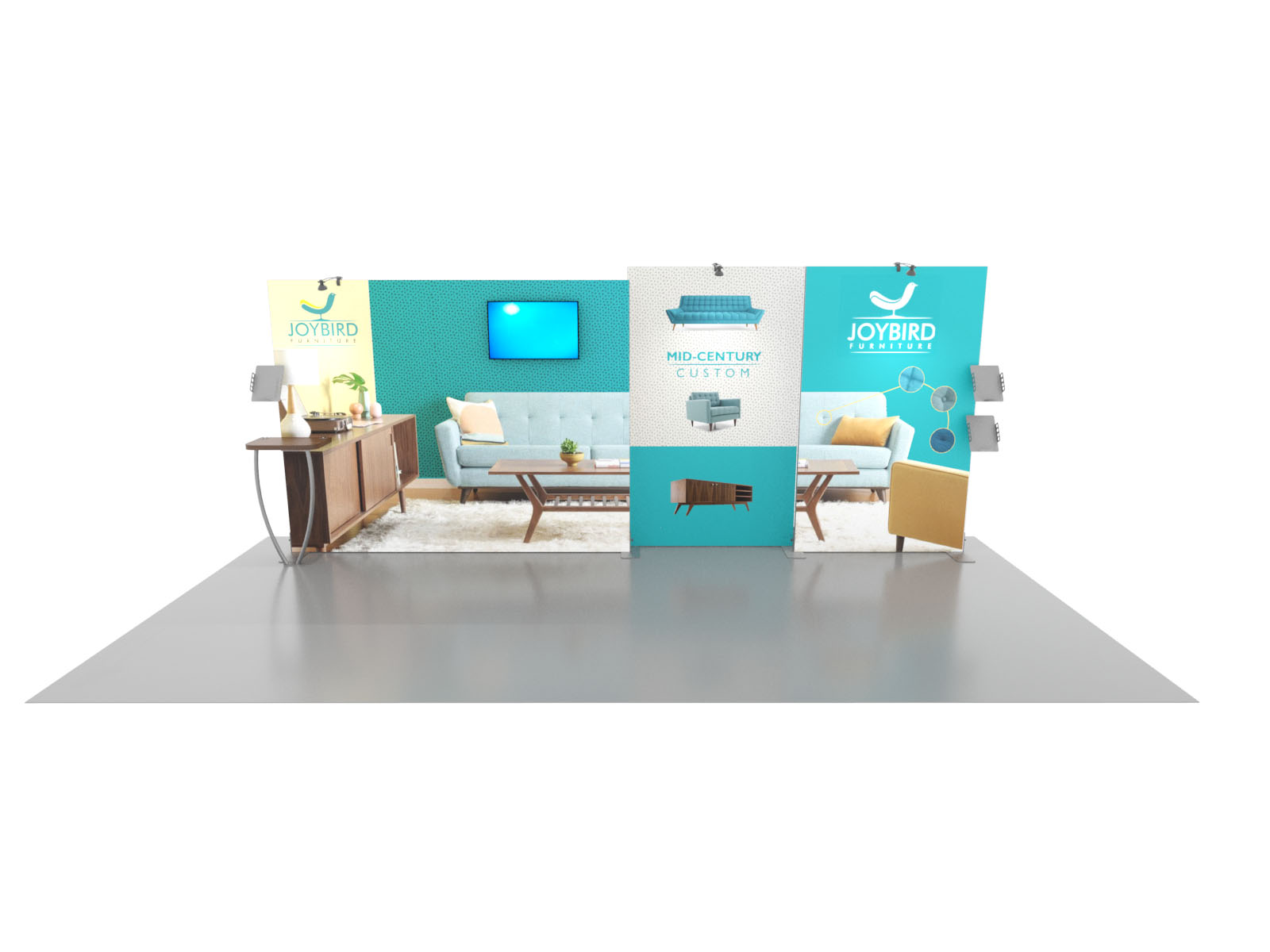 At trade shows, inline or linear trade show displays are generally arranged in a straight line alongside other exhibits. With this in mind, it’s especially important that they’re bold and eye-catching. Common inline display sizes include 10x20, 10x30 or larger.